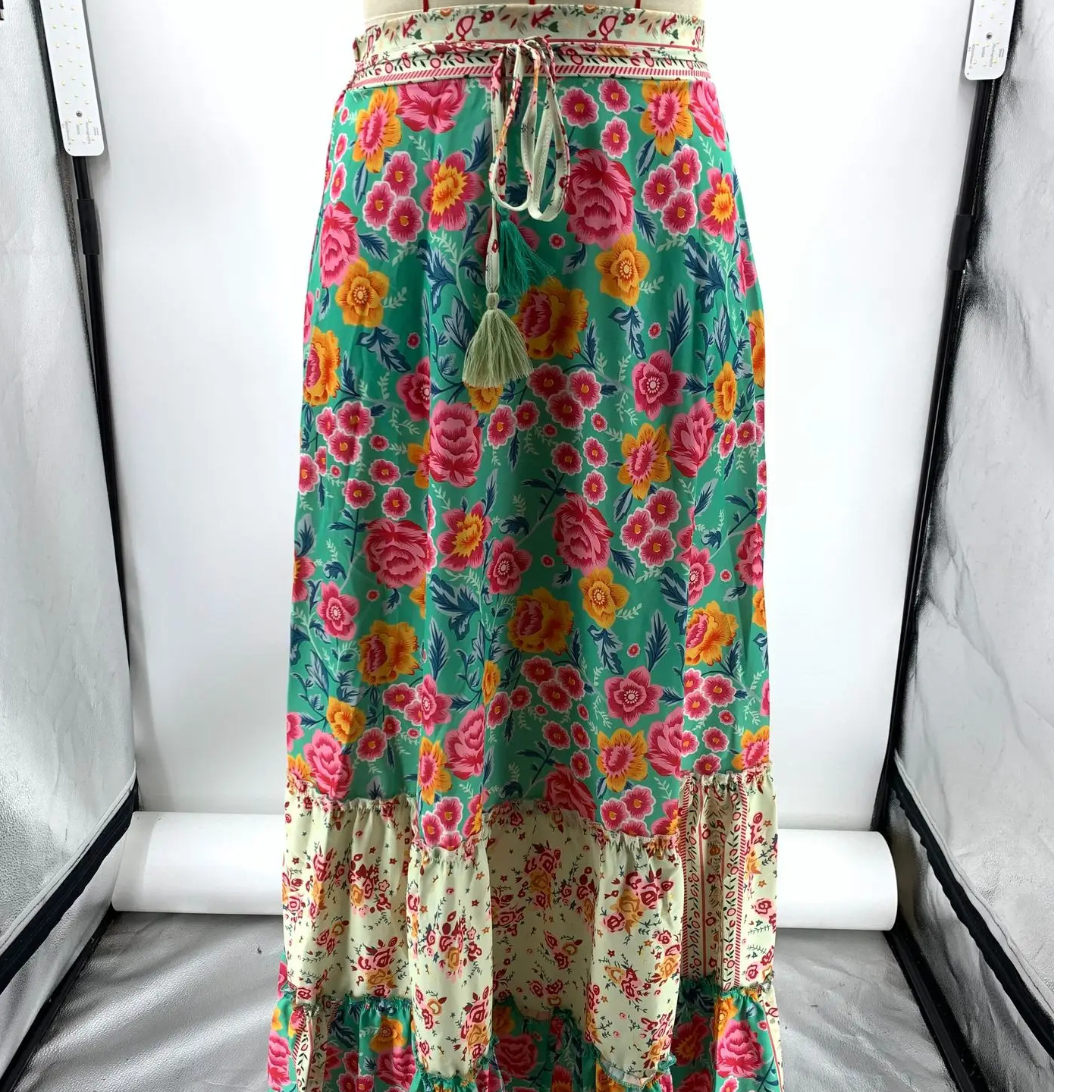 Cette jupe bohême longue imprimée à fleurs est conçue dans un tissu de qualité comportant un composant qui lui permet d'être extensible pour que vos mouvements soient toujours fluides. L'imprimé diffère avec la couleur de la jupe, ainsi les fleurs seront stylisées ou plutôt figuratives selon. Niveau design, elle possède deux volants en bas et un cordon de serrage à la taille.