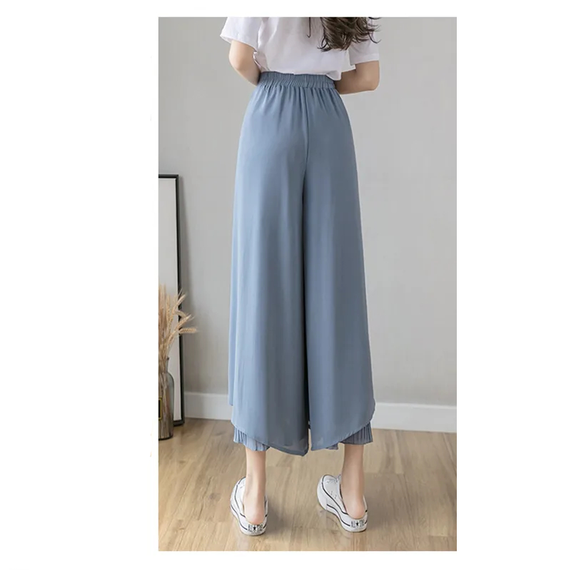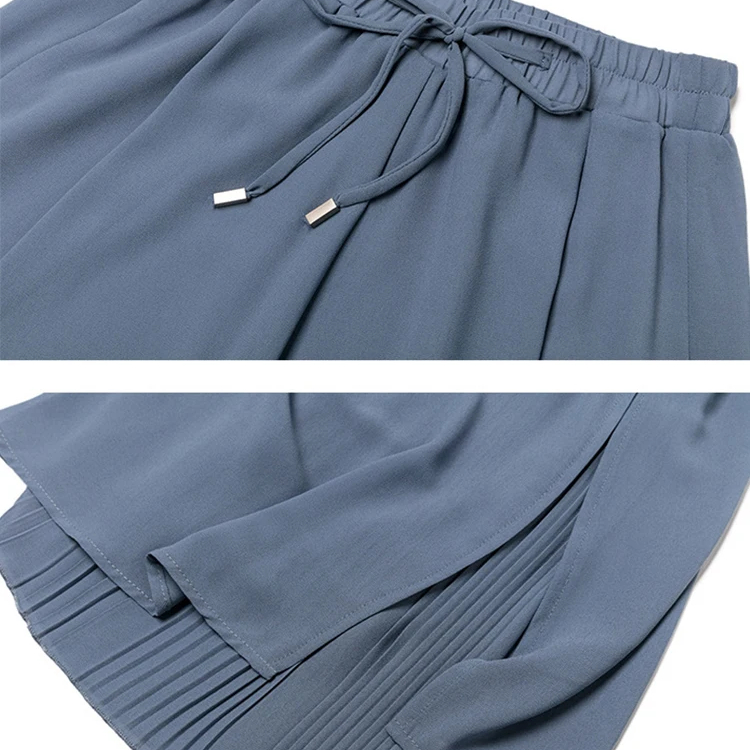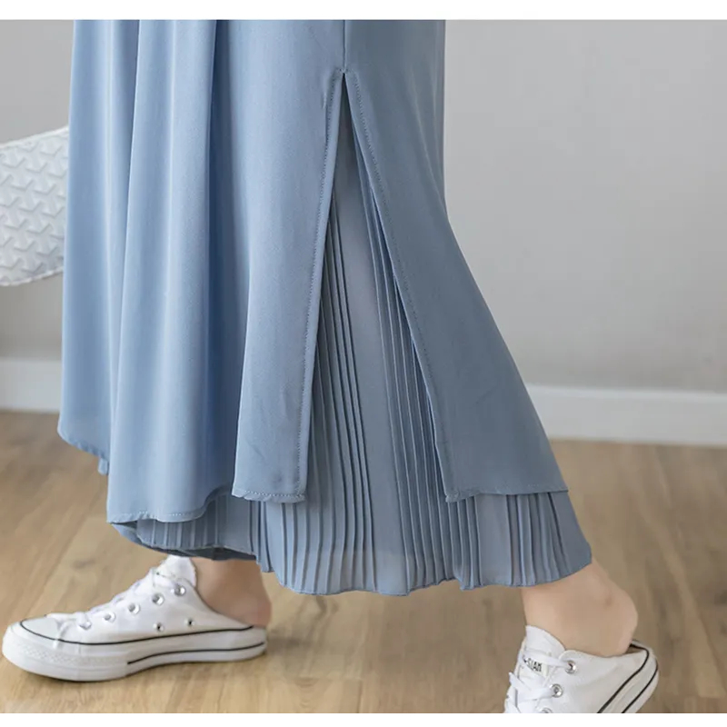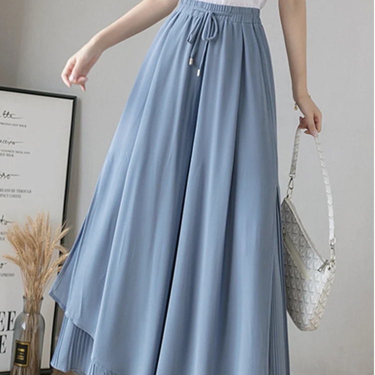 Cette jupe culotte large en mousseline est pourvue d'une taille élastique intégrale avec un cordon de serrage à nouer devant. La jupe en mousseline, légère et voluptueuse, se superpose au pantalon avec un fente sur le côté assez haute qui laisse voir le plissé soleil du dessous. Cet effet est très élégant et d'une grande finesse.