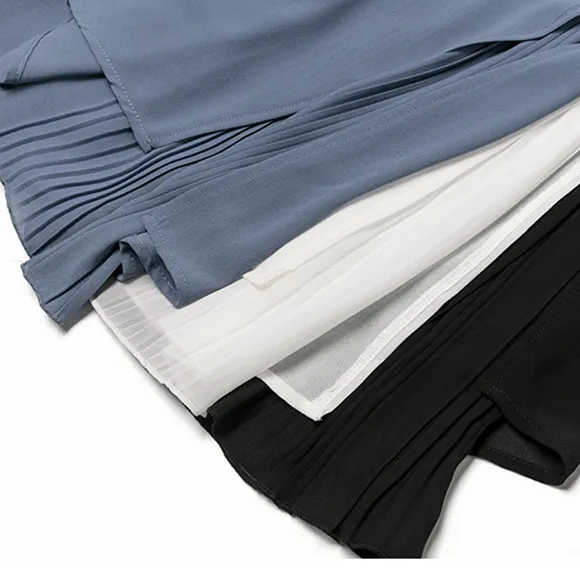 Cette jupe culotte large en mousseline a un effet pointu lorsque l'on regarde devant : c'est dû au design des côtés coupés en biseau pour laisser admirer le plissé soleil. Cette jupe d'une grande finesse peut très bien se croiser dans les occasions habillées comme des fêtes de mariage, de communion ou toute autre fête.