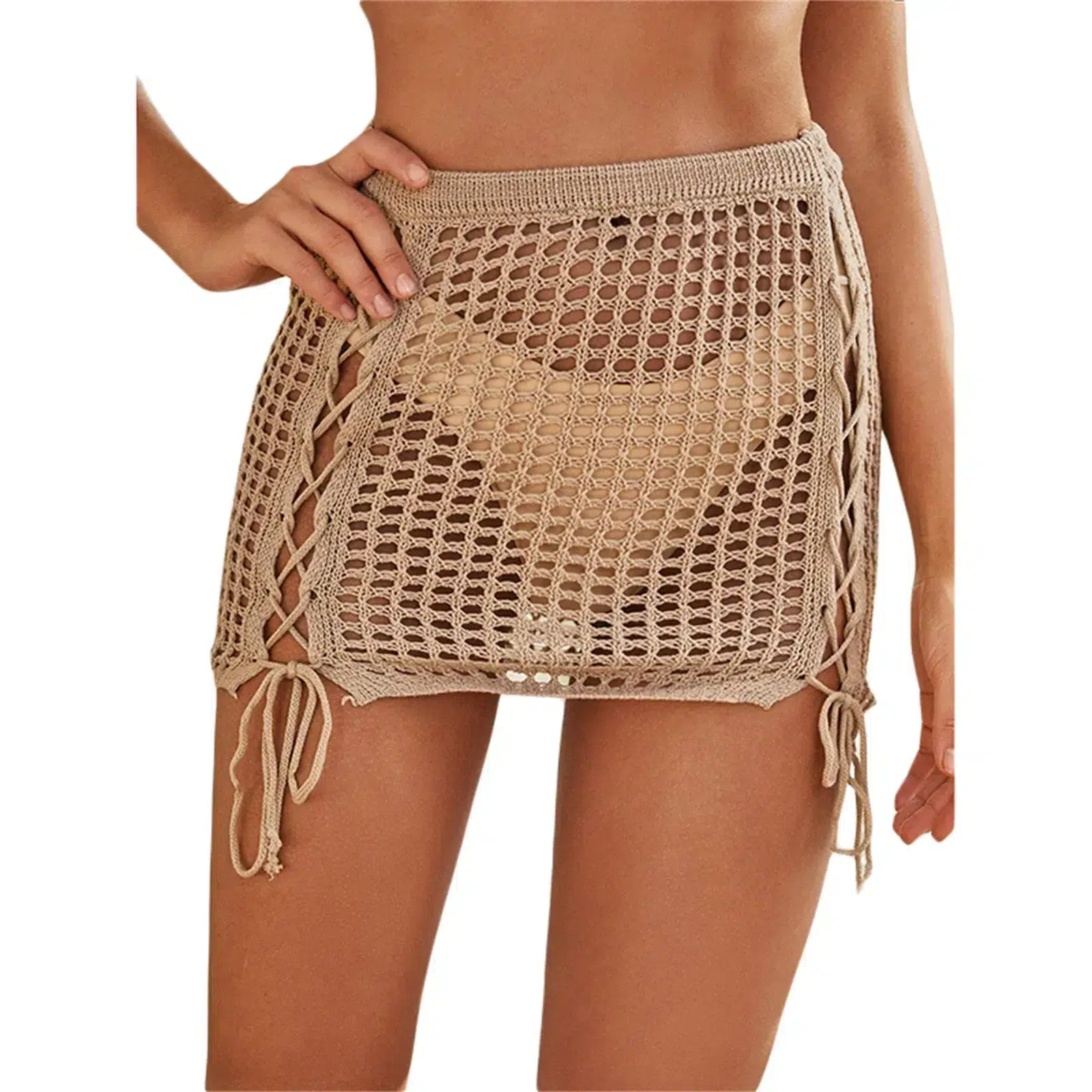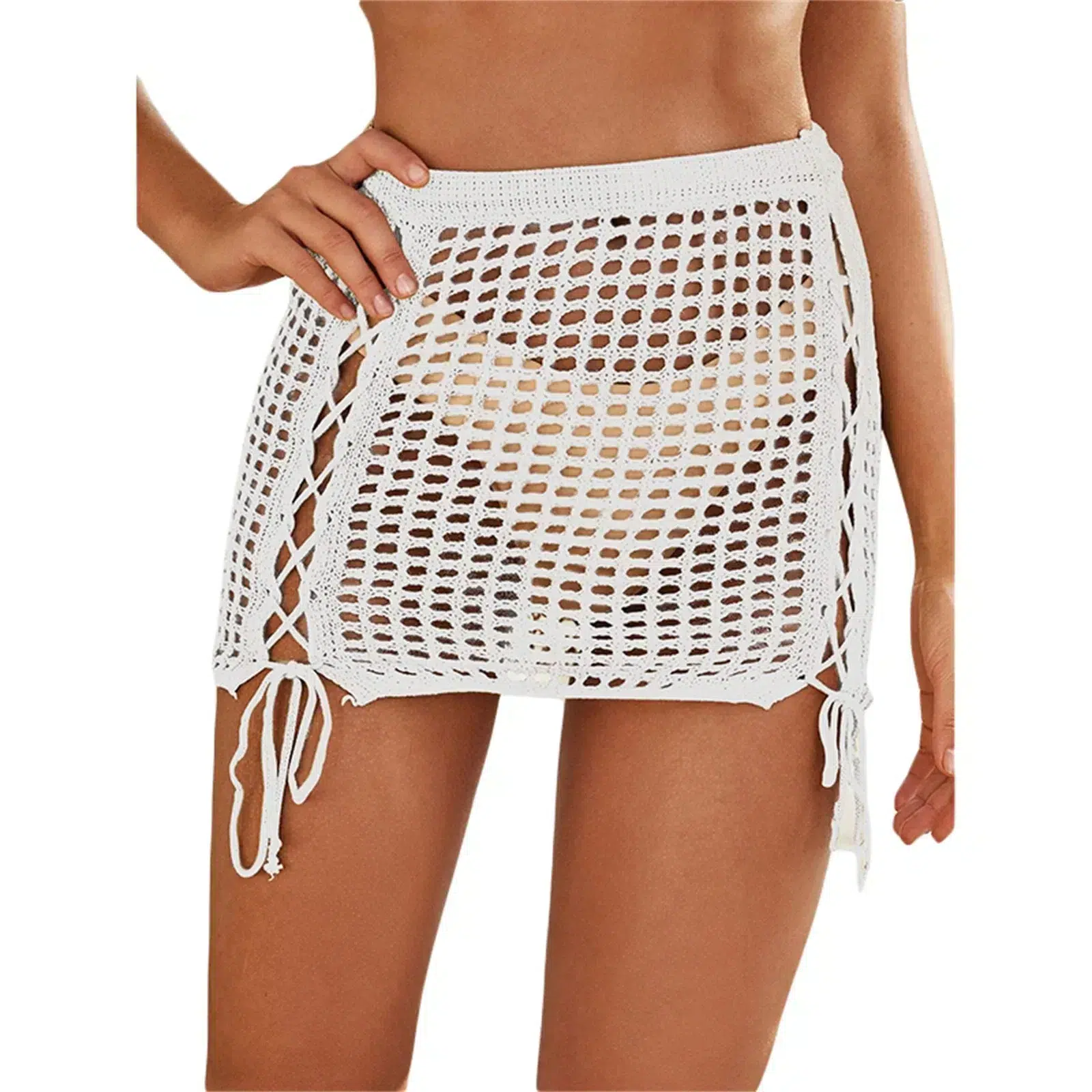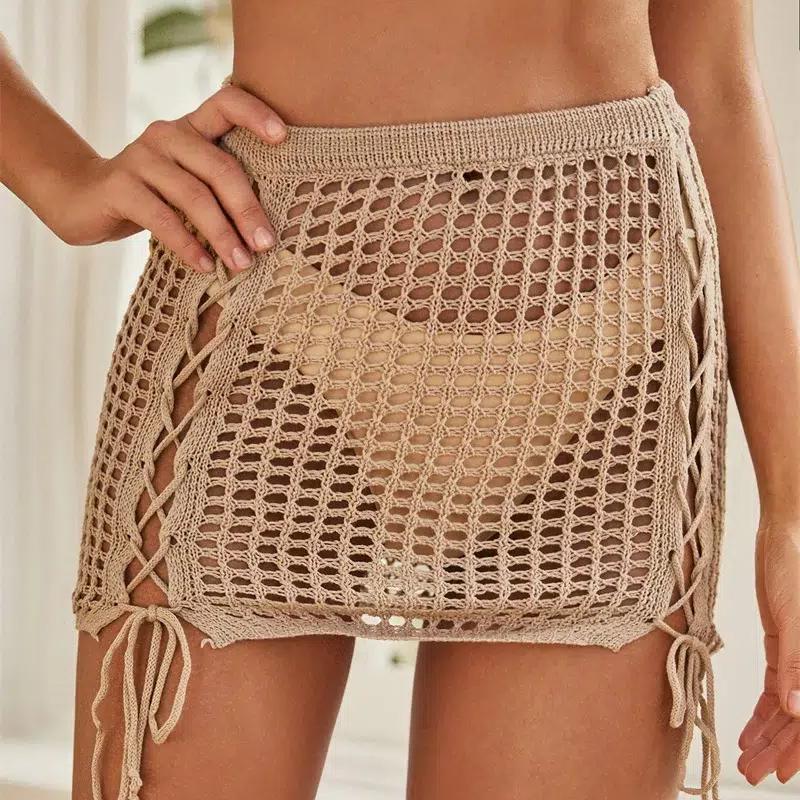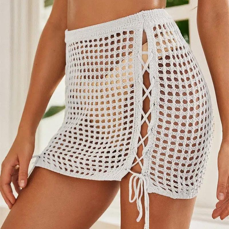 Cette jupe de plage en filet à mailles et croisillons à nouer est sexy avec sa transparence qui laisse voir ce que vous portez. La taille élastique aidera à la mettre et l'enlever. La maille comme une maille crochet est travaillée et fine et le lacet plat pour nouer passe dans des oeillets prévus à cet effet.