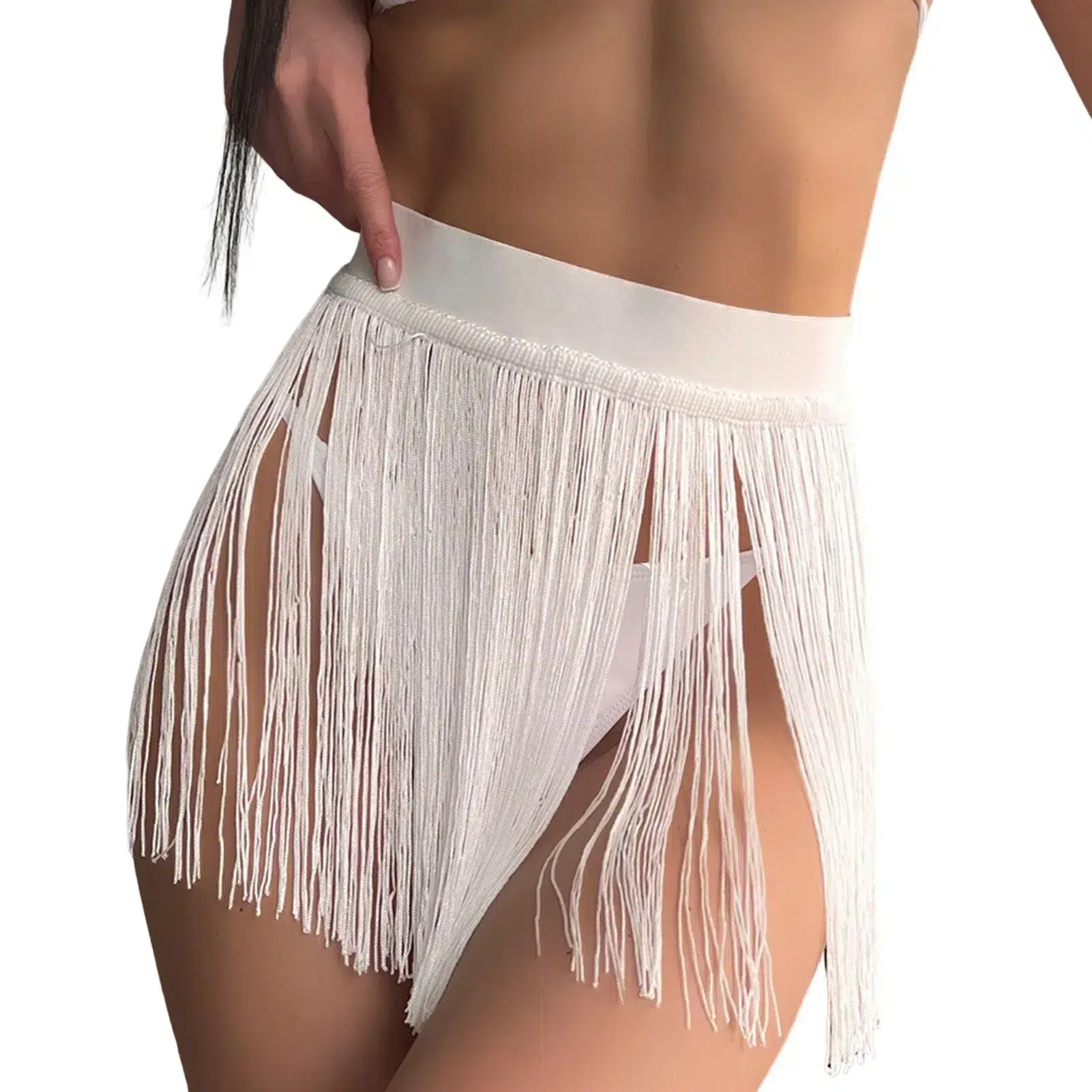 Cette jupe de plage mini à taille haute façon pagne possède une large taille élastique sur laquelle sont cousues toutes les franges de cette jupette. De ce fait, elle est facile à enfiler et à enlever, pratique au bord de l'eau. Son allure à la fois simple et sophistiquée ne laissera personne indifférent.