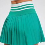 Le contraste entre le vert intense du tissu et les fines bandes blanches et vertes au niveau de la taille crée une composition visuelle moderne. Cette touche de design renforce le caractère unique de la jupe tout en mettant en valeur la zone abdominale sans effet moulant. Chaque bande accentue la ligne du vêtement, ajoutant une sensation de rythme à la coupe plissée. L’ensemble évoque fraîcheur et confiance.