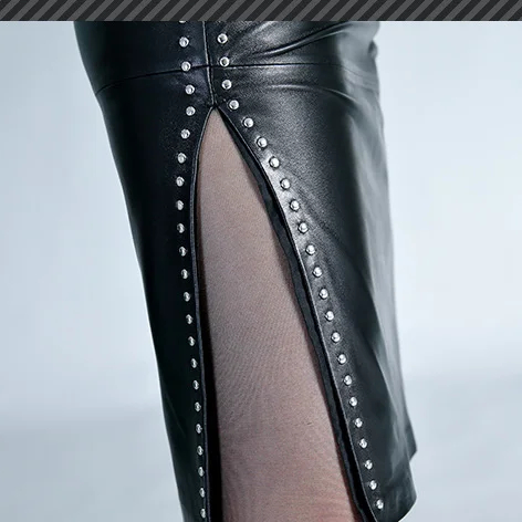 Cette jupe droite en cuir véritable est une jupe fendue très sexy : les clous qui ornent les bords de la longue fente sur la jambe remontent jusqu'à la taille et renforcent le côté sexy et sensuel. Sa longueur au genou et sa taille haute en font aussi un modèle glamour et raffiné.