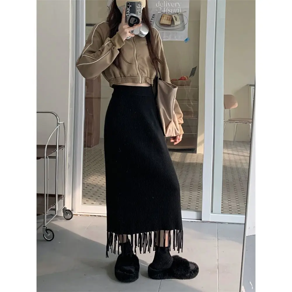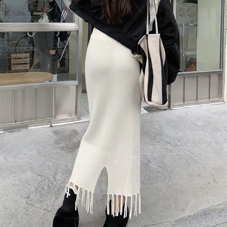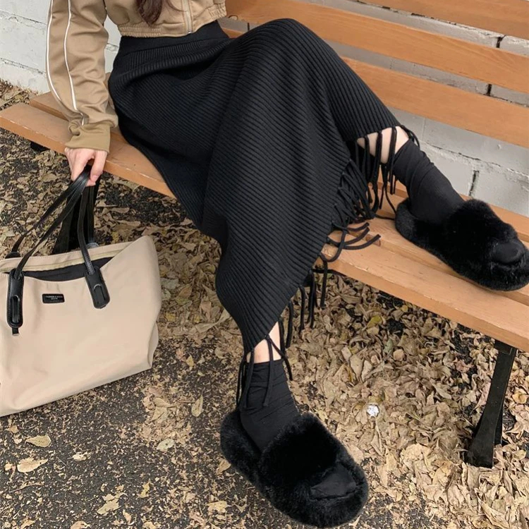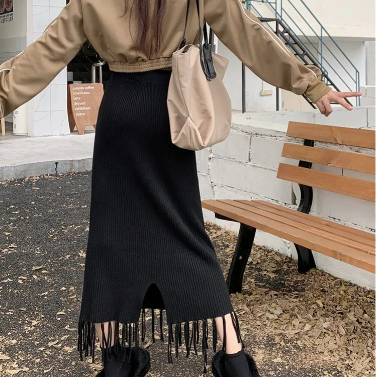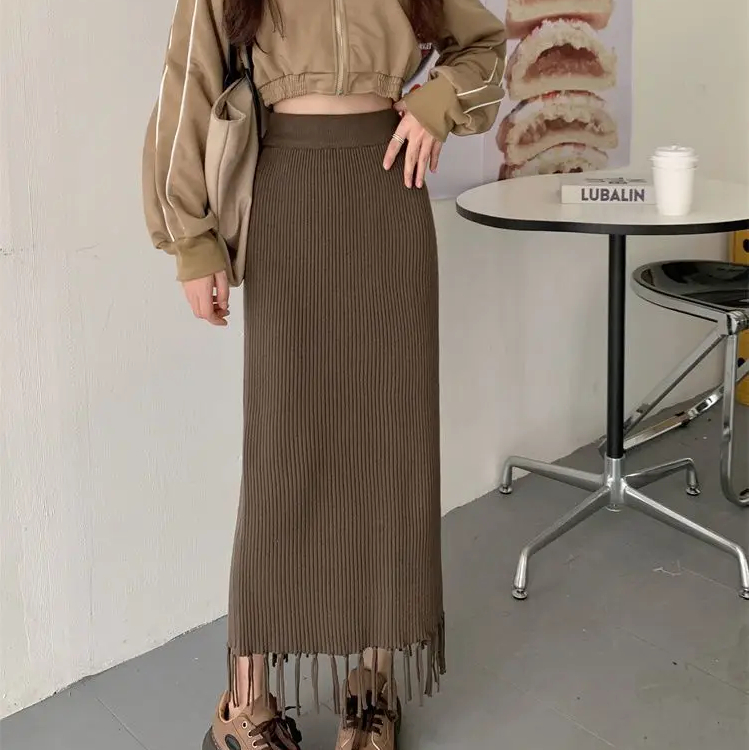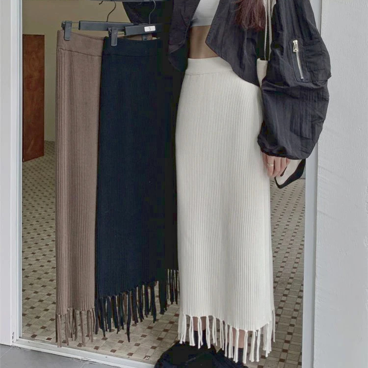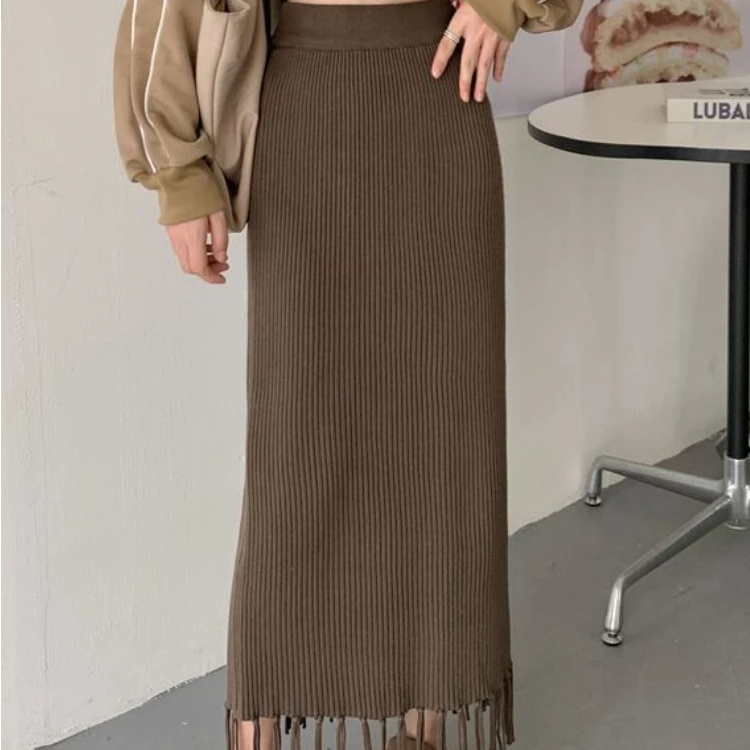 Cette jupe droite longue en tricot à franges est élégante par sa forme droite et pure : sa taille large élastique est fonctionnelle car aide à l'enfiler et délicate en même temps par sa texture. Elle vous permettra de la porter en de multiples occasions que ce soit pour aller au travail ou en cours ou pour sortir.