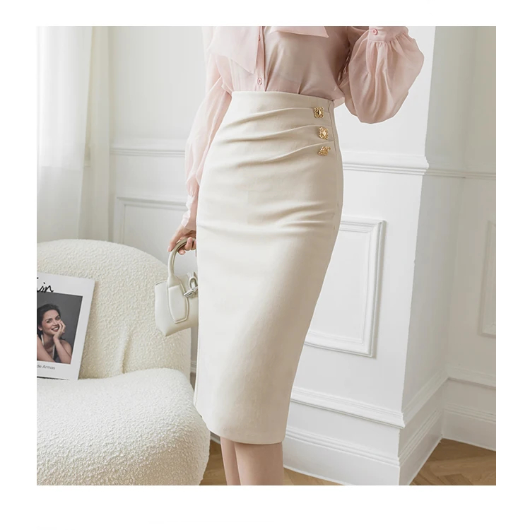 Cette jupe droite mi-longue possède un léger drapé devant au niveau de la taille orné par trois boutons dorés carrés. Cela lui donne, en plus de son allure élancée, une touche sophistiquée. Son look déjà très élégant avec son tissu de grande qualité au tombé impeccable est encore plus marqué grâce à des détails comme celui-ci.