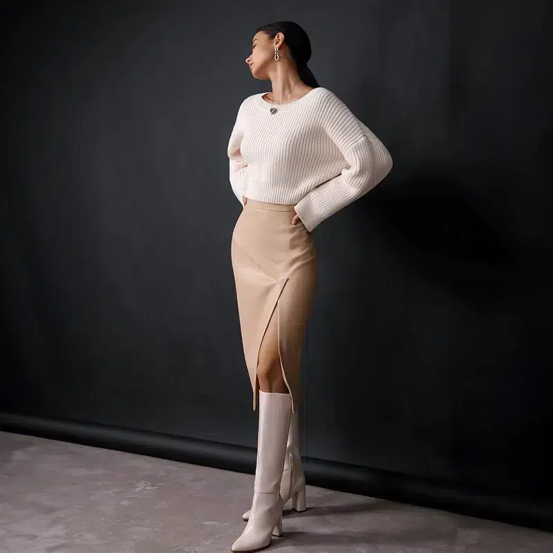 Cette jupe fendue mi-longue en simili cuir pour femme existe en deux teintes, noir ou beige : elle est aussi élégante dans les deux couleurs et seul votre goût personel saura trancher. Elle sera parfaite en journée avec un gros pull over et des bottes ou le soir avec un joli body et des escarpins, à vous de jouer.