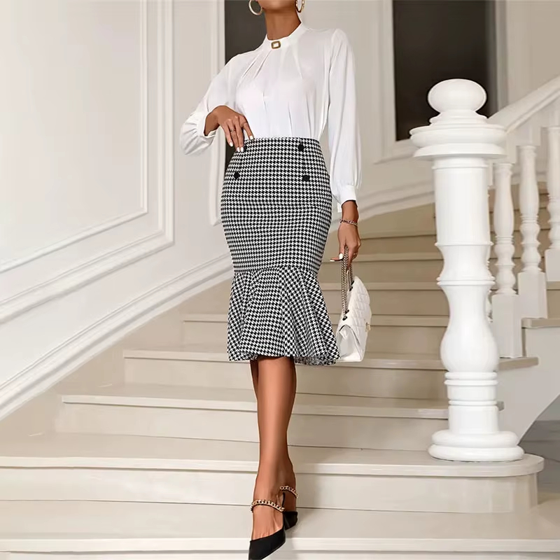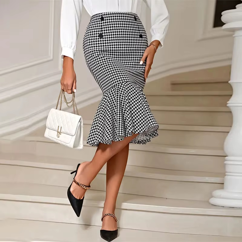 La combinaison du noir et du blanc, renforcée par le contraste du pied de poule, rend chaque tenue unique et séduisante. Avec une chemise sobre, la jupe s’adapte à un cadre professionnel. Avec un haut raffiné, elle devient idéale pour une sortie élégante. Elle s’accorde à toutes vos envies et affirme un style féminin assumé. Elle transcende les tendances pour offrir une allure sûre et distinguée.