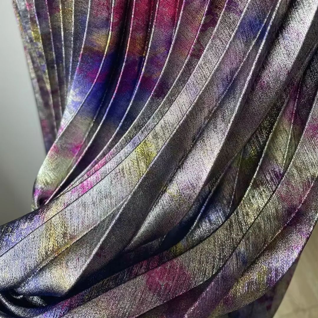La microfibre utilisée ici se distingue par sa finesse et sa douceur exceptionnelle. Elle permet un plissé net, stable et régulier qui conserve tout son relief même après de longues heures portées. Ce tissu réagit au mouvement avec une fluidité remarquable, donnant une impression d’ondulation constante. Une microfibre de qualité qui élève cette jupe au rang de pièce d’exception.