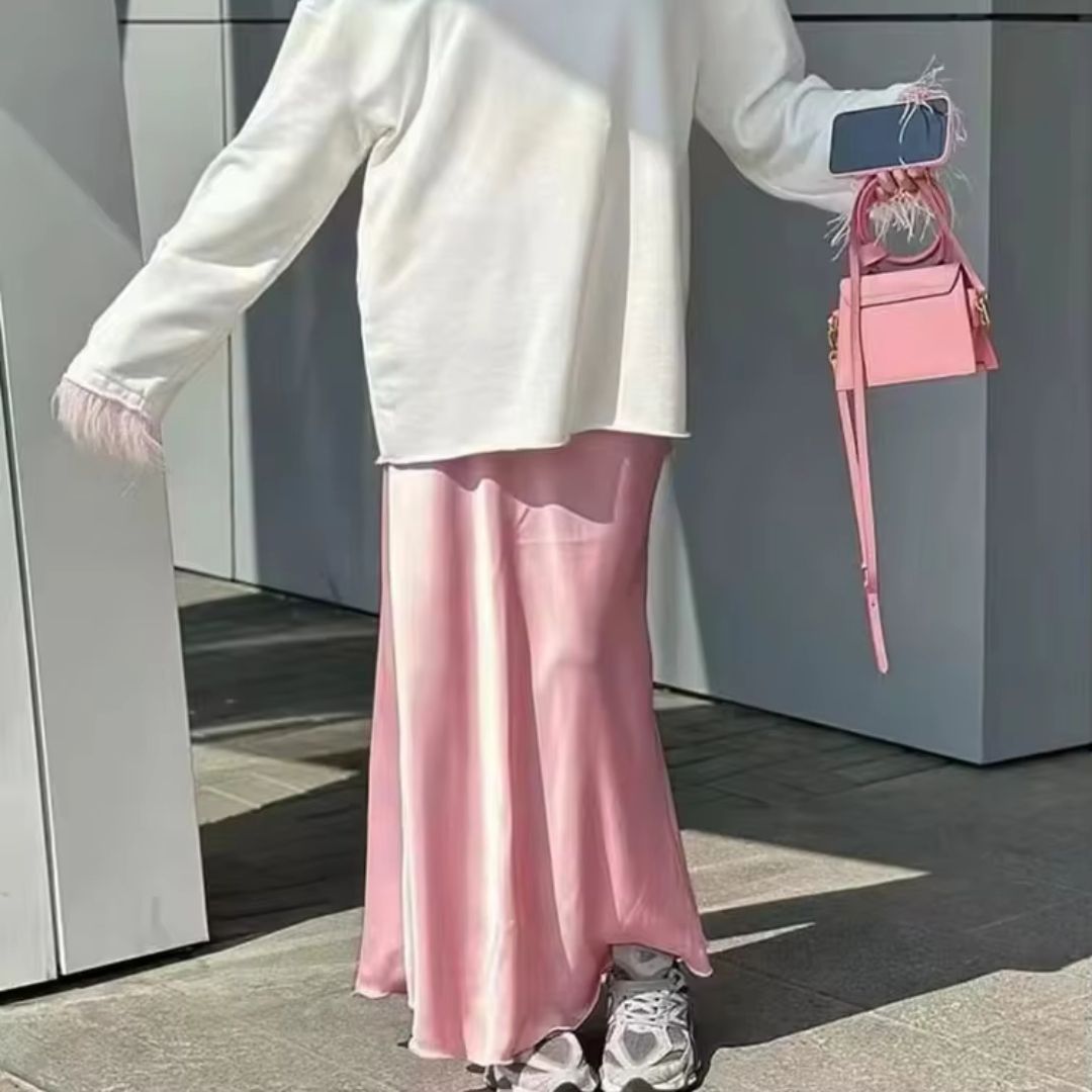 L'effet satiné de cette jupe longue n'est pas seulement beau à regarder ; il est également conçu pour capturer la lumière de manière magnifique, enrichissant chaque couleur et chaque mouvement. La jupe est aussi confortable à porter, avec une taille bien ajustée qui flattera toute silhouette.