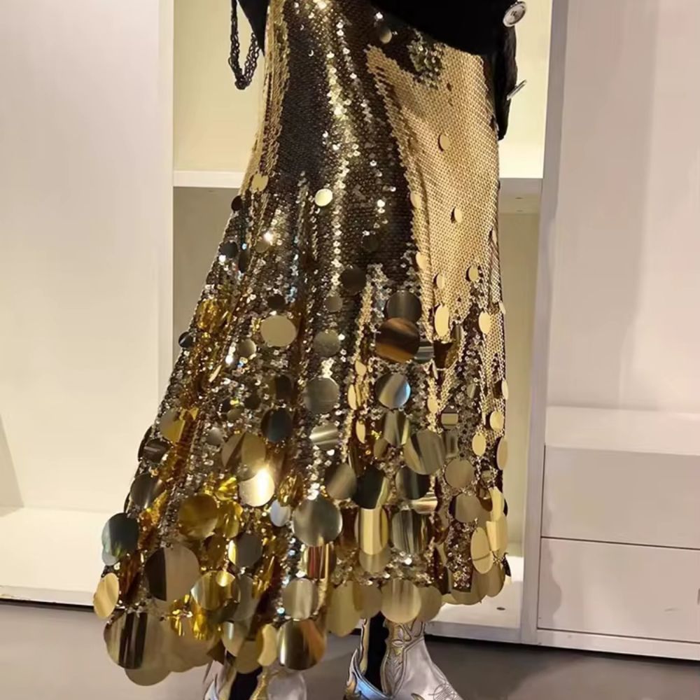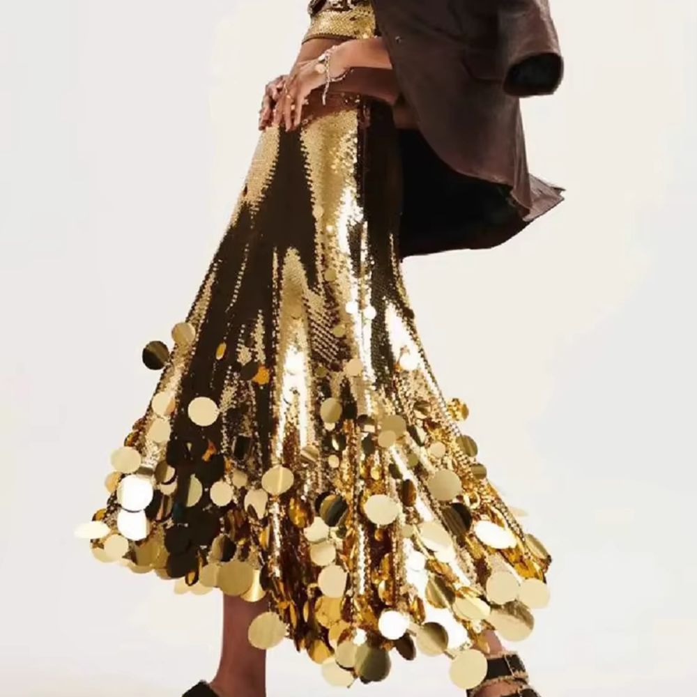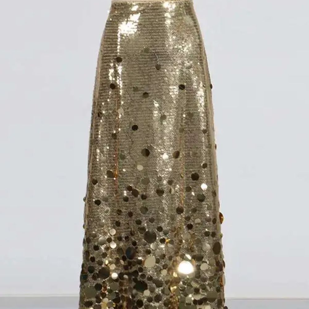 Les sequins dorés recouvrent uniformément toute la surface de cette jupe pour un effet maximum garanti. Chaque paillette reflète la lumière différemment selon vos mouvements et crée des reflets changeants. La fixation solide empêche les sequins de se détacher. Cette densité de paillettes vous assure une brillance constante. L'effet visuel reste saisissant même de loin.