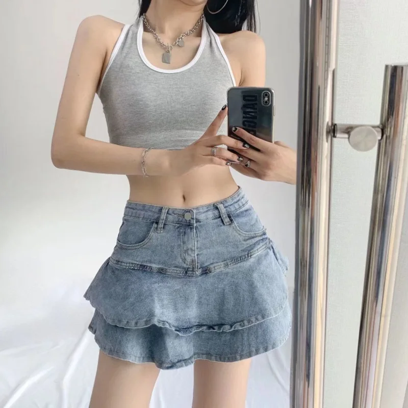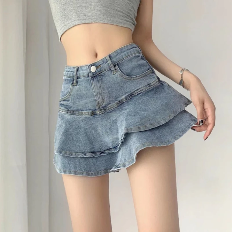 La coupe de cette mini-jupe en denim à volants est flatteuse pour toutes les silhouettes. Elle est ajustée au niveau de la taille, puis s'évase légèrement vers le bas pour une allure élégante et féminine. De plus, elle met en valeur vos jambes, ce qui ajoute une touche de sensualité à n'importe quelle tenue.