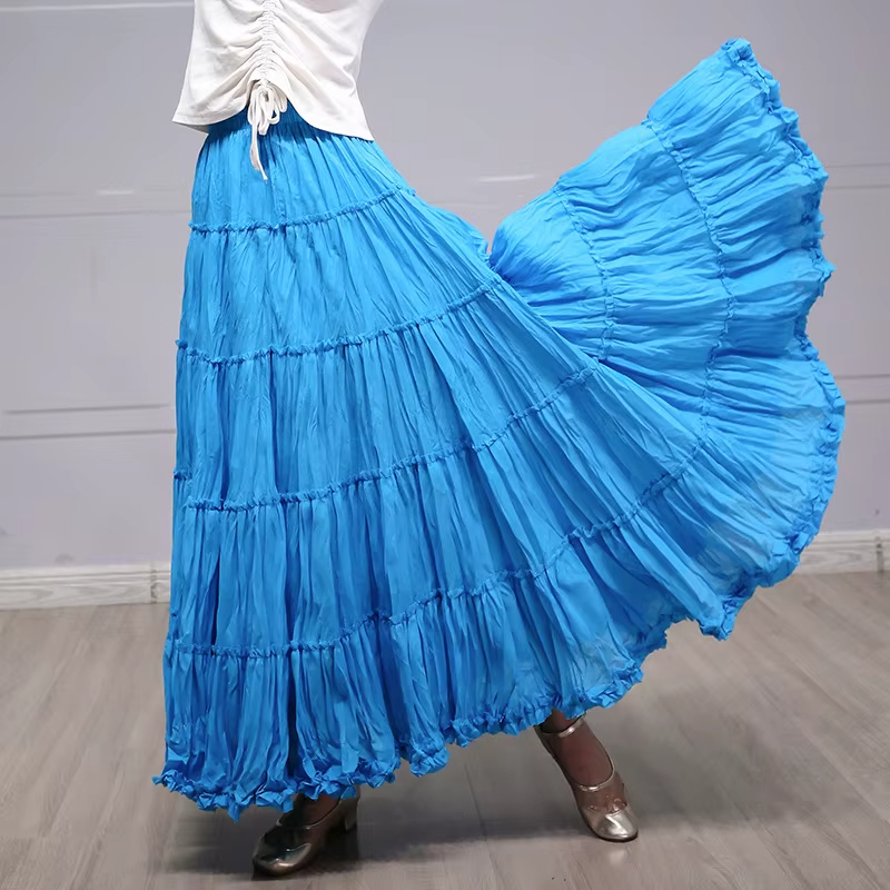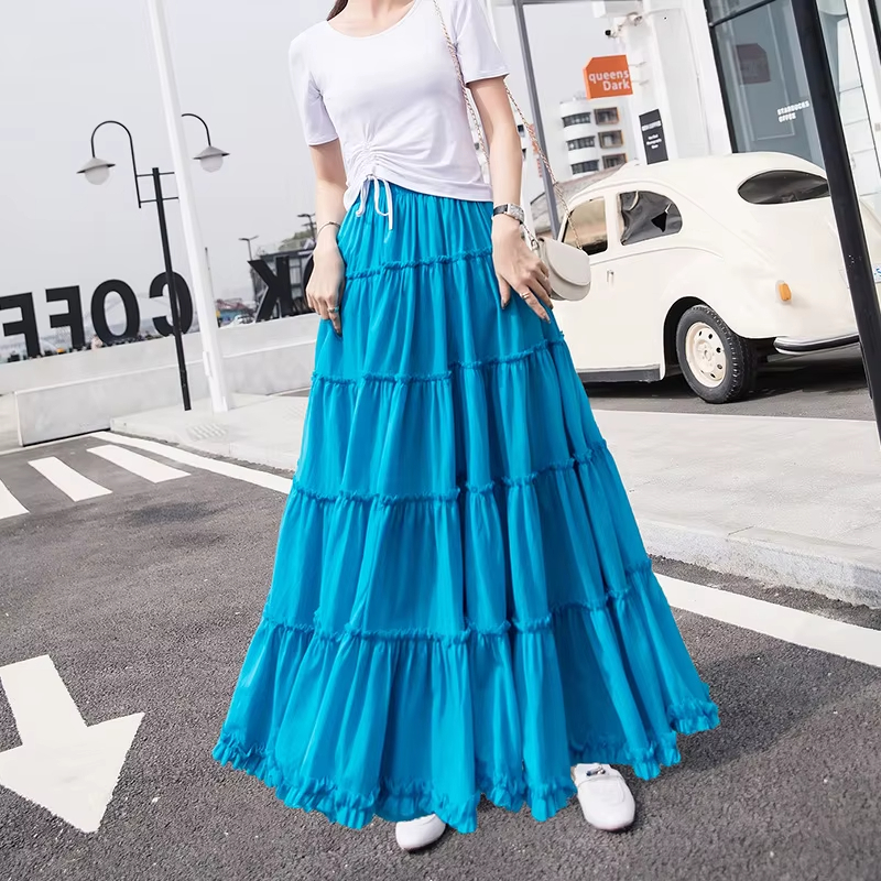 Cette jupe couleur bleue joue sur des reflets changeants au gré de la lumière, ce qui valorise les volants dans une variation d’intensités lumineuses. Cette teinte vivifiante met en valeur le dessin des volants et la coupe sirène large. L’ourlet, d’une précision soignée, finit la jupe sur une note élégante. Ce coloris lumineux fait ressortir les détails de la structure, renforçant le caractère vivant d’un modèle pensé pour être admiré.