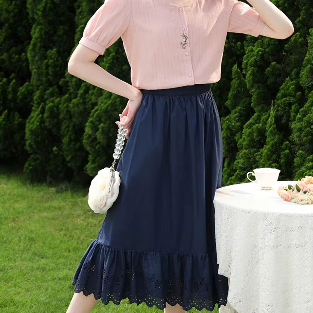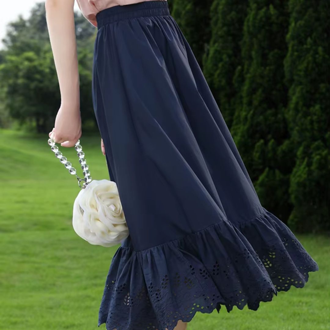 La jupe couleur bleu marine offre une teinte profonde qui valorise le motif dentelé et les finitions soignées. Ce coloris riche se prête aux jeux de lumière, laissant entrevoir le dessin des dentelles en contraste discret. L’ourlet soigneusement travaillé ponctue la pièce d’une finition nette, renforçant le caractère de ce modèle unique. Cette harmonie entre nuance profonde et motif raffiné compose une esthétique où chaque détail joue son rôle, sans superflu.