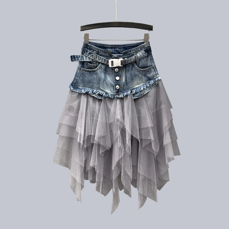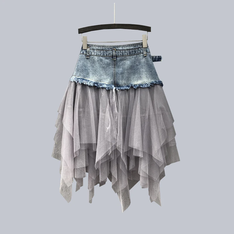 Jupe trapèze en dentelle patchwork jean taille haute